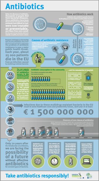 En toda Europa se están llevando a cabo una serie de iniciativas para difundir los mensajes sobre los riesgos asociados al uso inadecuado de antibióticos e informar sobre el uso prudente de los mismos. La gran mayoría del consumo humano de antibióticos ocurre en la comunidad (fuera de los hospitales).