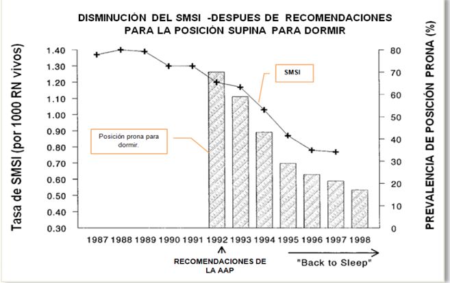 En la década siguiente, la incidencia de muerte súbita en los Estados Unidos disminuyó sorprendentemente en un 53%. Desde entonces, la tasa de muerte súbita se ha mantenido estable, mientras que las tasas de mortalidad infantil en general de Estados Unidos han disminuido ligeramente. Cada año en los Estados Unidos, 4.500 muertes se clasifican como de muerte súbita infantil inesperada (SUDI). Esto incluye las muertes por SMSI o asfixia durante el sueño, y muertes en las que no existía suficiente información para clasificar la causa. Aproximadamente 2.500 de estas muertes son causadas por SMSI. Hay una marcada disparidad en la incidencia de muerte súbita entre razas y grupos étnicos, estas diferencias se correlacionan con las distintas prácticas culturales en la posición para dormir de los lactantes.
