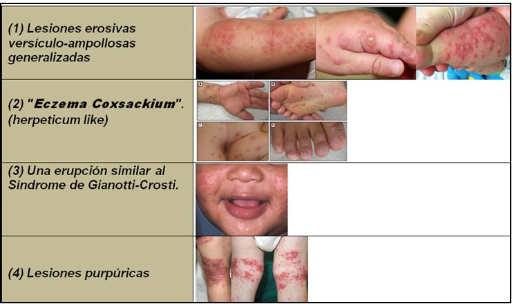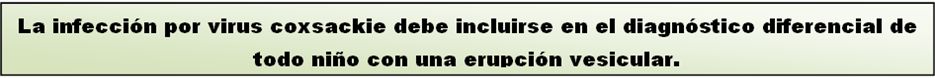 Aunque es rara, el eczema coxackium, y otras manifestaciones cutáneas atípicas de infección por virus coxsackie debe incluirse en el diagnóstico diferencial del niño con una erupción vesicular.