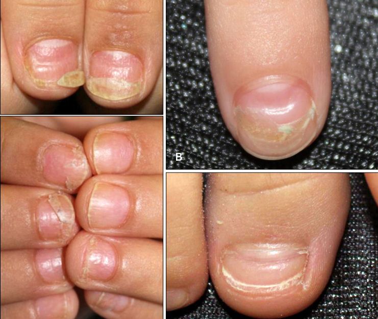 Manifestaciones cutáneas retardadas de este exantema incluyen cambios en las uñas y descamación de las palmas y plantas, que por lo general se produjo semanas después de la resolución de la erupción versículo-bullosa.