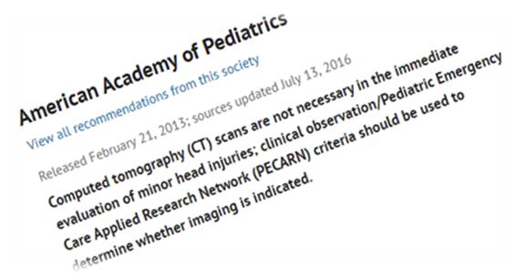 El reconocimiento de este riesgo ha impulsado los esfuerzos para limitar los estudios innecesarios de imágenes. Las reglas de predicción clínica de lesiones cerebrales traumáticas (PECARN) de la Red de Investigación Pediátrica de Atención de Emergencia (PECARN) identifican con precisión a los niños con bajo riesgo de un TBI clínicamente importante. Como parte de la campaña 'Elegir Sabiamente', una iniciativa de la Junta Americana de Medicina Interna, junto con la Academia Americana de Pediatría (AAP) sugieren que las reglas PECARN / TEC en combinación con la observación clínica se deben utilizar para determinar si la imagen está indicada.