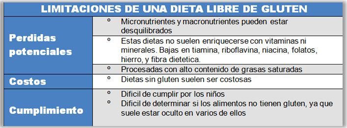 Indicaciones para considerar una dieta libre de gluten en un niño incluyen, lo más importante, el diagnóstico de la enfermedad celíaca para el cual una dieta sin gluten es un tratamiento definitivo. Junto con la enfermedad celíaca, las otras 2 condiciones principales para las cuales una dieta libre de gluten debe ser considerada son la alergia al trigo y la sensibilidad al gluten.