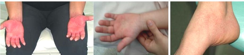 Petequias y erosiones de la mucosa son frecuentes y pueden sumarse síntomas sistémicos como malestar general, artralgias y fiebre de bajo grado. El exantema papulo-purpúrico en  'Guantes y calcetines', en general respeta la cara, excepto la zona peribucal.
