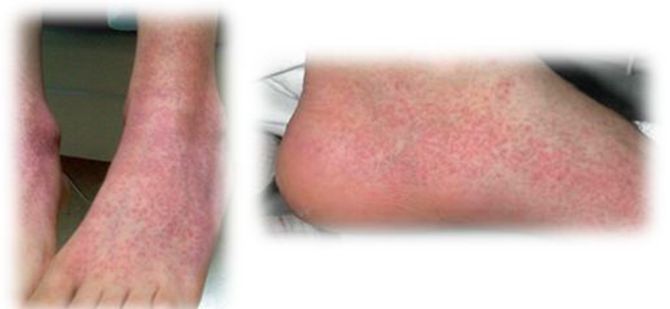 Los pacientes con exantema papulo-purpúrico en  'Guantes y calcetines' (PPGC) presentan clásicamente con dolor, edema y eritema simétrico de las manos y los pies asociados con una púrpura petequial que está muy delimitada en las muñecas y los tobillos.