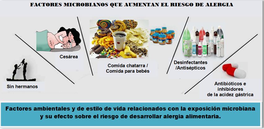 Aunque los factores genéticos pueden predisponer a los individuos al desarrollo de alergias, no pueden explicar los cambios en la epidemiología en este corto período de tiempo, lo que sugiere que los factores ambientales pueden desempeñar un papel en el desarrollo de los trastornos alérgicos, incluyendo la vía de parto, el uso de antibióticos, la microbiota intestinal, la falta de lactancia materna y la dieta temprana del lactante.
