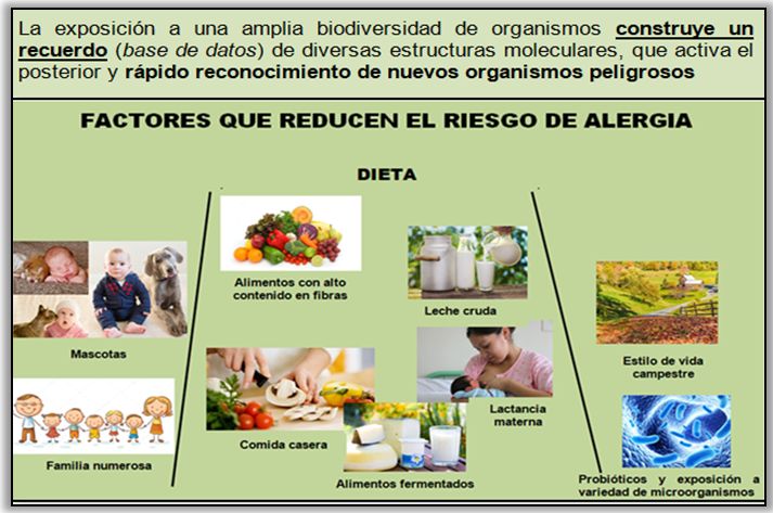 La exposición a una amplia biodiversidad de organismos construye un recuerdo (base de datos) de diversas estructuras moleculares, que activa el posterior y rápido reconocimiento de nuevos organismos peligrosos: esto funciona porque todas las formas de vida comparten bloques moleculares básicos. Por otra parte, los componentes microbianos como los peptidoglicanos y los lipopolisacáridos (LPS) tomados del intestino mantienen la activación de base, del sistema inmune innato.