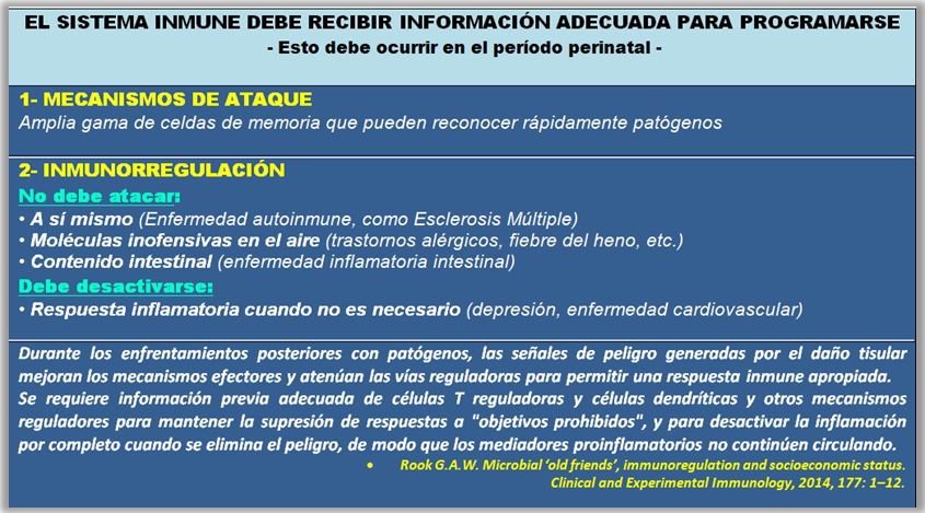 Al nacer, el sistema inmune ha heredado genéticamente mecanismos de acción, pero carece de datos. Tiene cierto conocimiento de sí mismo (antígenos propios), adquirido a medida que los linfocitos maduran en el timo y un conocimiento mínimo del mundo exterior, transferido desde la madre a través de la placenta. Después del nacimiento necesita exposiciones microbianas por varias razones. Unas son parte de las señales dependientes de microbios para el desarrollo del sistema inmune, anteriormente mencionado.