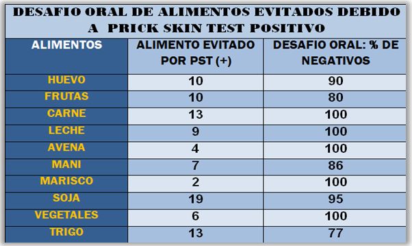 Los test dérmicos positivos, no son suficientes para determinar una alergia a un determinado alimento, con la consecuencia de su exclusión en la alimentación del niño. Muchos de los niños que bajo estas circunstancias se les ha pohibido un alimento determinado, a veces muy necesario para su nutrición, al ser desafiados con el alimento prohibido, resulta que el mismo es tolerado en un gran porcentaje, mostrando que no tienen una hipersensibilidad al mismo.