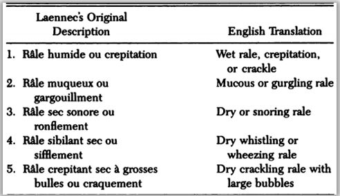 Laennec separó los sonidos que se producen durante los movimientos respiratorios en cinco categorías, y se enumeran en el siguiente cuadro, junto con una traducción al inglés.