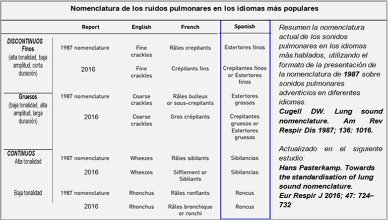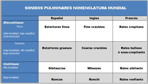La estandarización de la terminología en todos los países, podría mejorar la comunicación internacional sobre los hallazgos de la auscultación pulmonar.  En la siguiente tabla se muestran los resultados de unificar de distintos idiomas la nomenclatura de los ruidos pulmonares.