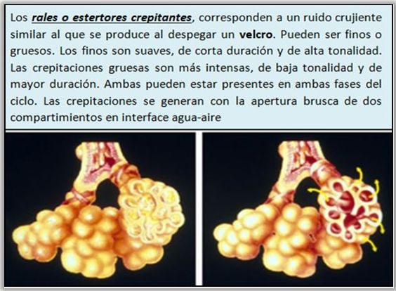....“Los crepitantes son probablemente producidos por más de un mecanismo. En general, se consideran probables 2 mecanismos diferentes: uno es la apertura repentina, de un proceso de vías respiratorias pequeñas con ecualización rápida de presiones que causa una secuencia de ondas de sonido implosivas, y el otro es el burbujeo de aire a través de las secreciones. El primero de estos 2 mecanismos es la causa probable de los crepitantes /crujidos; es probable que también sea la causa de los crujidos que se escuchan en la insuficiencia cardíaca congestiva, al menos en sus etapas iniciales.”