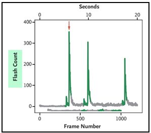 Se observó, que cuando la persona dijo 'estar sana', se generaron numerosas gotas que van desde 20 hasta 500 μm. La repetición de la misma frase tres veces (figura), con breves pausas entre las frases, produjo un patrón similar de partículas generadas, con números máximos de tamaño de la gota como 347 de intensidad, con el discurso más alto, y tan bajos como 227 de intensidad cuando el volumen disminuyó ligeramente durante tres ensayos