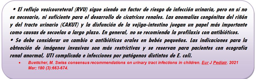 El reflujo vesicoureteral (RVU) sigue siendo un factor de riesgo de infección urinaria, pero en sí no es necesario, ni suficiente para el desarrollo de cicatrices renales.