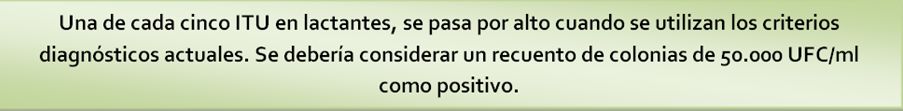 - Algunos investigadores sugieren que se disminuya el criterio bacteriológico para diagnosticar una ITU en lactantes y niños de 2 meses a 6 años con síntomas/fiebre y piuria, de ≥100 000 UFC /ml ó ≥50 000 UFC /ml,  a  ≥10 000 UFC /ml en una orina recolectada adecuadamente, esto no afectaría la especificidad diagnóstica, y aumentaría ligeramente la sensibilidad, de acuerdo con las directrices europeas recientes.