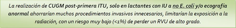 El RVU de alto grado afecta solo al 10% de los bebés con una primera ITU febril, el 90% comprendían resultados normales y grado I-II, la aplicación universal de estas recomendaciones a todos los grupos de edad conduciría a muchas investigaciones innecesarias.