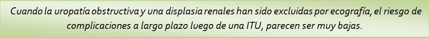 Sin embargo, en el grupo de pacientes con una ITU por E. coli asociada con una ecografía renal anormal, y en el grupo de pacientes con una ITU a no-E coli, asociada con una ecografía renal normal, se debe analizar individualmente el riesgo/beneficio. La ecografía siempre se recomienda después de la primera ITU febril, mientras que la CUGM solo en presencia de factores de riesgo, o anomalías en la ecografía.