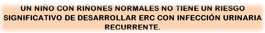 Salo (2011) Hannula (2012) Toffolo (2012) - En ausencia de anomalías renales estructurales evidentes en los estudios de imagen después de la 1°ITU en la infancia, el porcentaje de infecciones urinarias recurrentes en la infancia, como causa principal de ERC parece ser pequeña. Los autores concluyeron que la fracción etiológica de las infecciones urinarias recurrentes en la infancia como causa principal de ERC fue inferior al 1%, y que un niño con riñones normales no tiene un riesgo significativo de desarrollar ERC con infección urinaria recurrente.