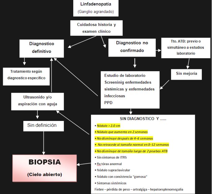 El siguiente algoritmo es generalmente recomendado, para el seguimiento de una adenopatía en niños. Resaltando