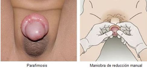 El tratamiento de la parafimosis (atascamiento del glande por el prepucio) consiste en la compresión del edema del prepucio durante unos minutos, y luego la reducción manual.