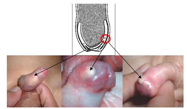El orificio prepucial en la fimosis puede variar, pero aquellos que parecen puntiformes, al realizar la tracción (foto) hacia arriba del prepucio - como si fuera una manga -  muestra un orificio realmente más amplio de lo que impresiona, sin ejecutar esta maniobra.