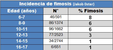 Oster en mas de 9500 observaciones en niños escolares de 6-17 años examinados anualmente durante 8 años, encontró que, la fimosis que se encuentra en el 4% de todas las observaciones, pero con una incidencia decreciente a lo largo de los años, del 8% en 6-7 años de edad al 1% en 16-17 años de edad.