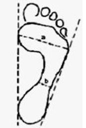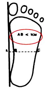 Algunos autores definen pie plano cuando la distancia del borde interno del pie es menor de 1 cm. con respecto a la tangente interna (Fig.)