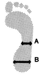 Arch Index (AI): Otros reconocidos ortopedistas como Staheli, proponen diferentes medidas: La anchura del pie en la zona del arco y la anchura del talón fueron medidos, y el primero (A) fue dividido  por el último (B) para calcular el índice de arco para cada pie. El índice de arco de promedio fue 0,71 para varones y 0,66 para  niñas.  El AI es la relación de la línea A a la línea B,  la anchura máxima de la zona del talón (A / B x 100%)