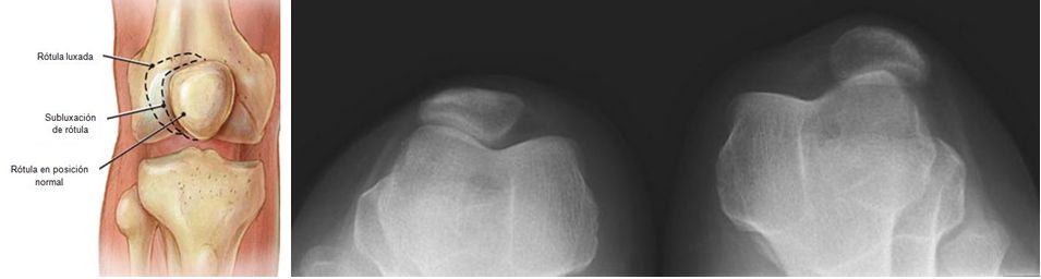 La compresión rotuliana se produce con la subluxación de la rótula lateralmente, y suele estar presente un leve derrame. Inflamación de la rodilla moderada a severa puede indicar hemartrosis, lo que sugiere la luxación patelar con fractura osteocondral y sangrado.