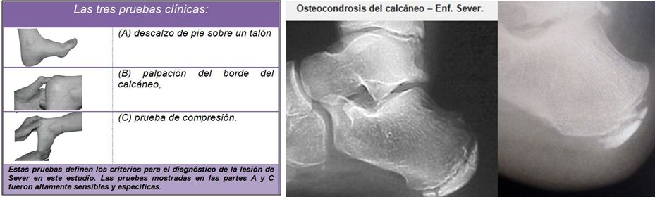 En un estudio se investigó, si la identificación de la enfermedad de Sever es fiable con las radiografías solas. Ochenta radiografías del pie (50 chicos con apofisitis calcáneo y 30 niños sanos) fueron incluidas en este estudio. Dos consultores cirujanos ortopédicos fueron instruidos para realizar un diagnóstico sin información clínica sobre los pacientes. Evaluaciones radiológicas se realizaron en orden aleatorio por cada observador en dos ocasiones diferentes,   Los resultados de este estudio mostraron que la identificación radiológica de apofisitis calcáneo sin la ausencia de información clínica no era fiable. Los hallazgos radiológicos que se atribuyeron a la enfermedad de Sever mostraron una amplia variación entre observadores independientes y entre lecturas separadas por el mismo observador. El diagnóstico de apofisitis del calcáneo, es una decisión clínica, y la evaluación radiográfica parece ser innecesaria.