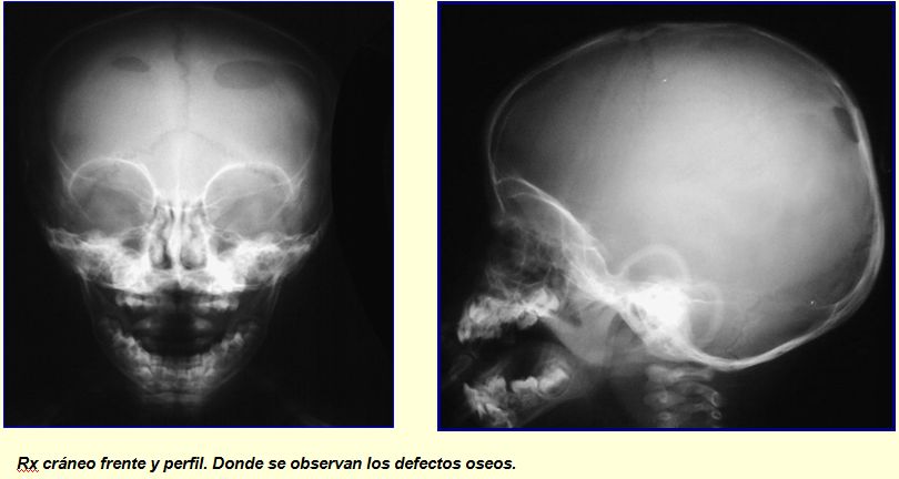 Al examen físico (datos positivos) se palpan dos depresiones de un centímetro de diámetro aproximadamente, en región parietal posterior, simétricas, no se evidencian lesiones del cuero cabelludo. La radiografía de cráneo muestra dos imágenes radiolúcidas circulares en región parietal, coincidentes con las depresiones que se palpaban.